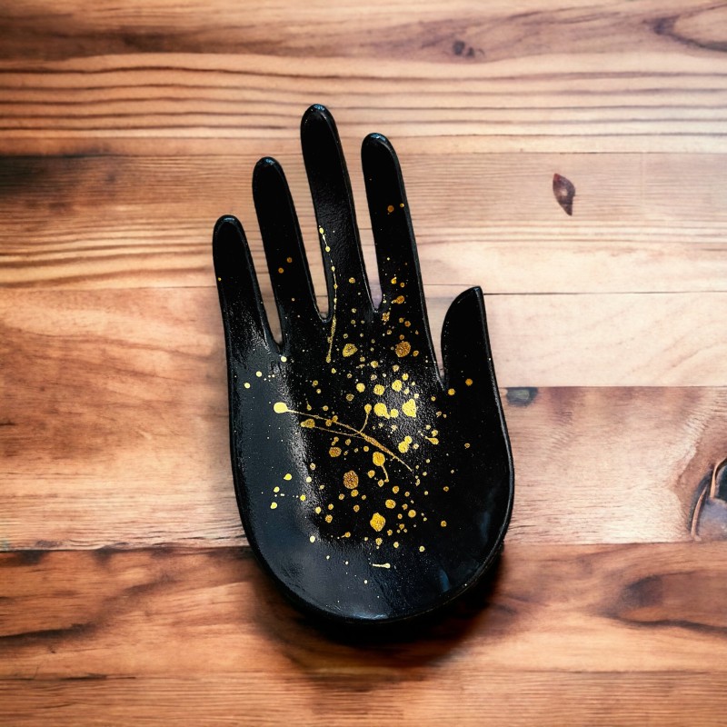 Czarna, błyszcząca dłoń z kropkami złota. Wygląda jakby właśnie złapała kawałek kosmosu – i trzyma go dla Ciebie. Ceramiczna podstawka Gwiezdny Pył przyciąga spojrzenia, ale ma też konkretne zastosowanie: sprawdzi się jako miejsce na biżuterię, klucze, pierścionki po całym dniu albo kryształ, który trzeba mieć pod ręką. Dosłownie pod ręką.