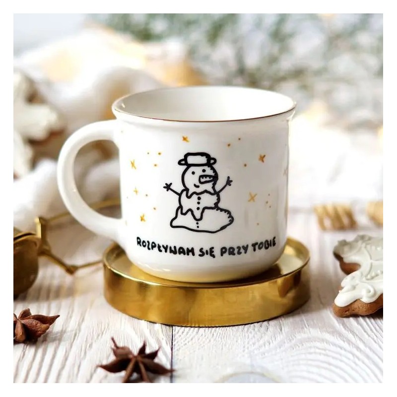 Zapraszamy do otulenia się ciepłem świątecznego nastroju z naszym porcelanowym kubkiem "Świąteczny Bałwanek". Z miłością malowany ręcznie, każdy kubek jest niepowtarzalny, oferując indywidualny charakter każdej chwili. Jego pojemność wynosi 300 ml, co zapewnia idealną ilość Twojego ulubionego napoju. Śmietankowa biel porcelany z eleganckim, złotym rantem dodaje wyrafinowania, a kształt zapewnia wygodne chwytanie. Zachwyć się wyjątkowym designem i ciesz się świątecznymi chwilami z kubkiem, który jest prawdziwą ozdobą każdego stołu.