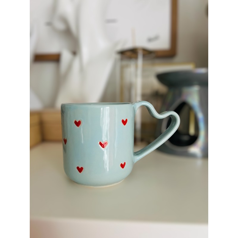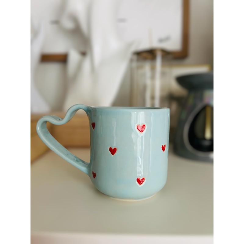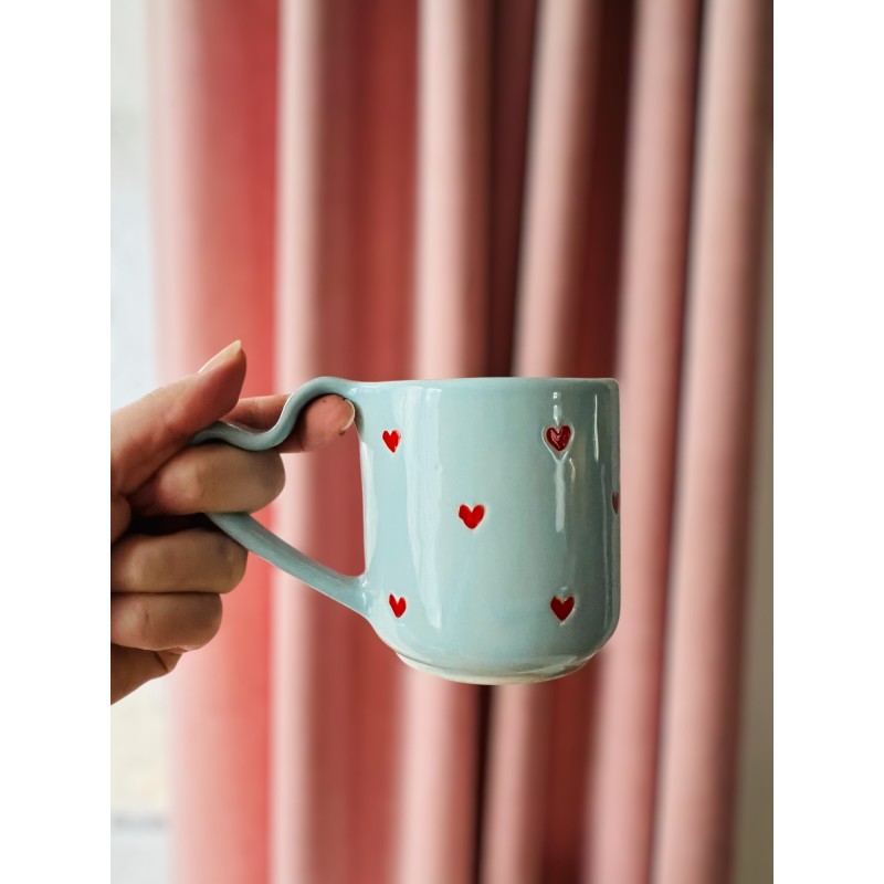 Błękitny kubek z uchem w kształcie serca od Naturalnie Studio – ręcznie robiony, malowany i szkliwiony. Idealny na prezent, do kawy, herbaty i codziennego przytulania się do ciepła. ????