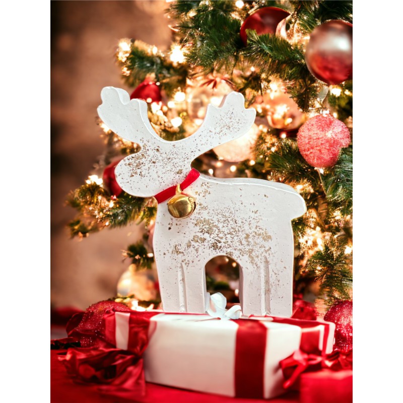 Gipsowy renifer w bieli, z lekkim brokatowym pyłem, przynosi do domu świąteczny nastrój. Udekorowany czerwoną wstążką z dzwoneczkiem, wygląda uroczo i elegancko. Idealny do umieszczenia gdziekolwiek, by dodać odrobinę magii zimowym dniom.