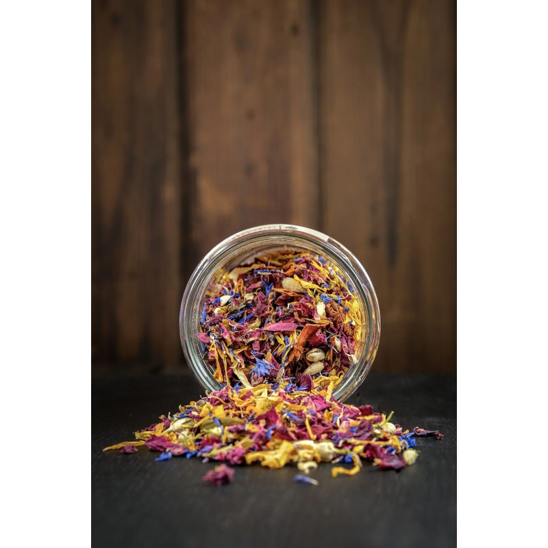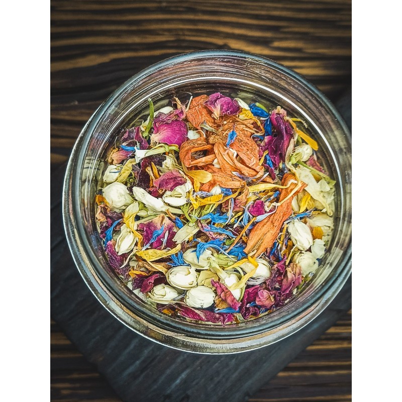 Pąki jaśminu, róża i piwonia dodają subtelnej elegancji, nagietek i bławatek – wakacyjnych barw, a płatki lilii i dziewanny wnoszą odrobinę lekkości. Idealne do czarnych i zielonych herbat, ale sprawdzą się też solo – jako kolorowy napar na leniwe popołudnie.