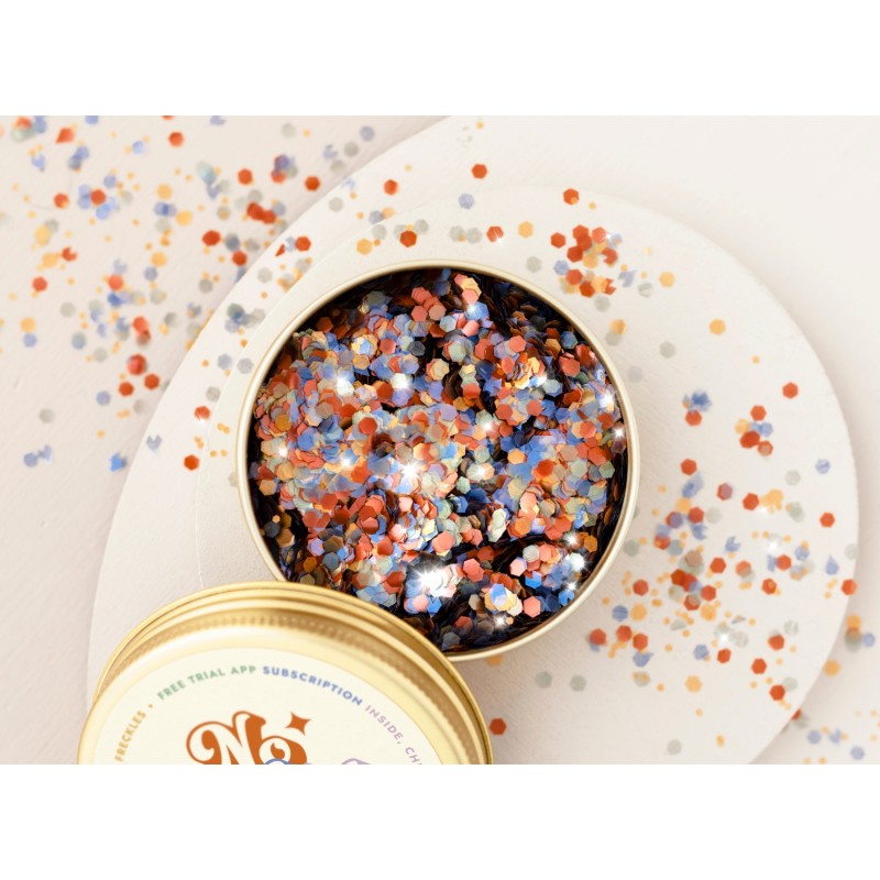 Ten brokat nie przypomina dziecięcych ozdóbek. Jest jak cicha iskra. Wykonany z biodegradowalnej pochodnej celulozy, zamknięty w aluminiowej puszce, która zmieści się wszędzie. Nie pachnie, nie świeci neonem. Po prostu odbija światło – Twoje światło.