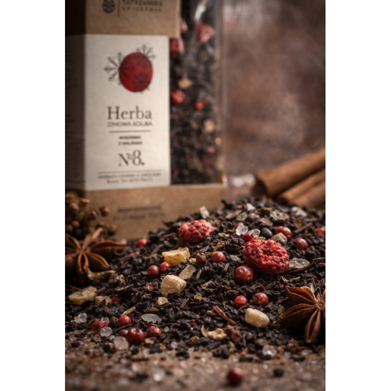 Herba Zimowa Koliba to czarna herbata z maliną liofilizowaną, imbirem i różowym pieprzem – wyraźna, korzenna, lekko owocowa. Taka, która nie udaje deseru, tylko rozgrzewa od pierwszego łyku. Smakuje jak wieczór w górskiej chacie: drewno w piecu, śnieg za oknem i spokój, który w końcu ma głos.