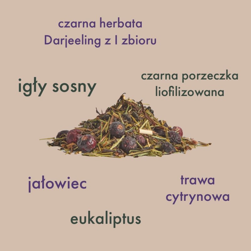 czarna herbata Darjeeling FF* (48%), igły sosny (30%), czarna porzeczka liofilizowana (14%), jałowiec, eukaliptus, trawa cytrynowa