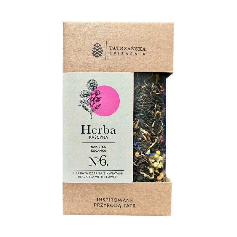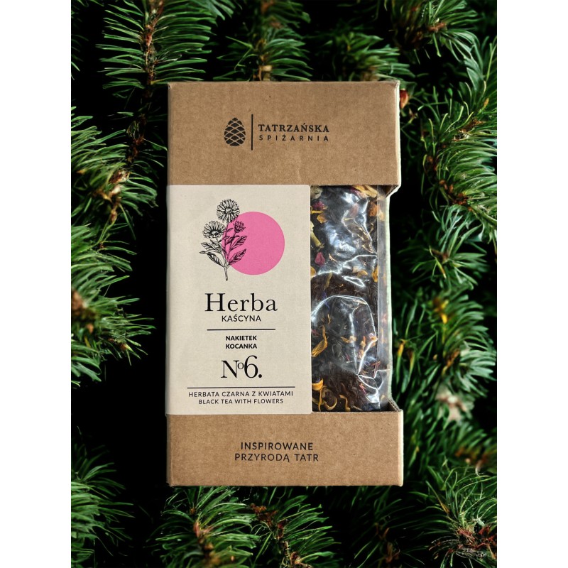 Czarna herbata z charakterem i bukietem jak z górskiego ogrodu. Herba Kaścyna to aromatyczna mieszanka czarnej herbaty i wyselekcjonowanych kwiatów oraz owoców – od jarzębiny po pączki róży, od jaśminu po kocankę. Pachnie jak zachód słońca nad Tatrami i smakuje równie malowniczo.