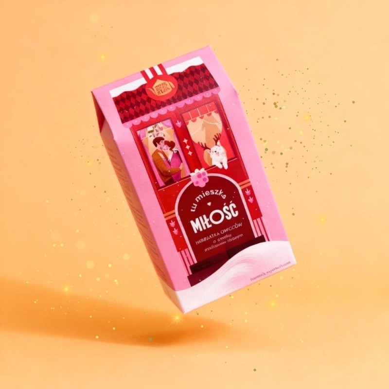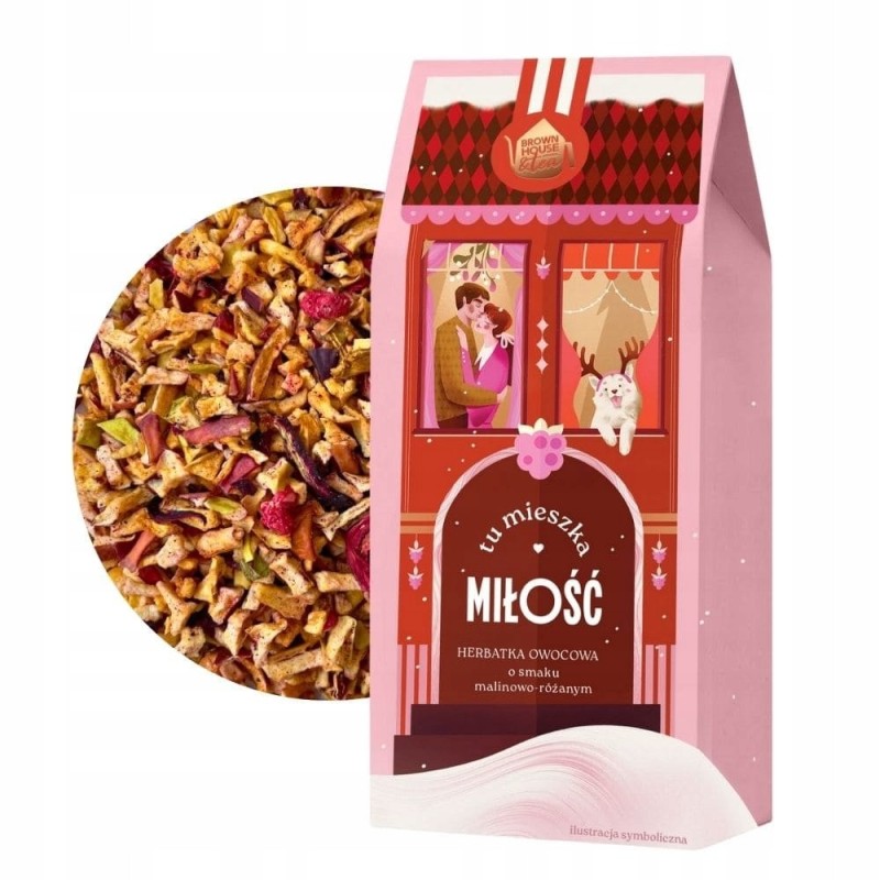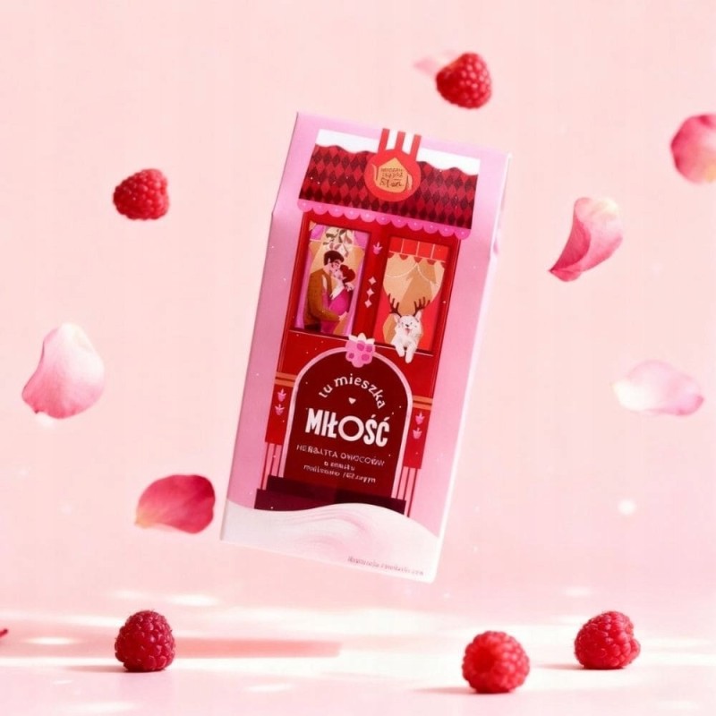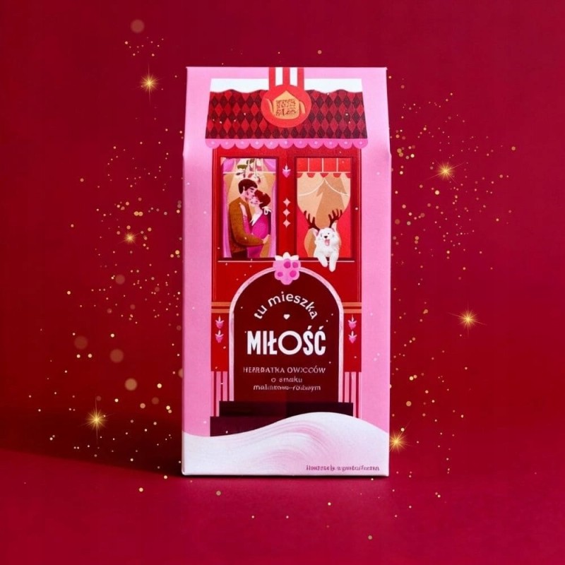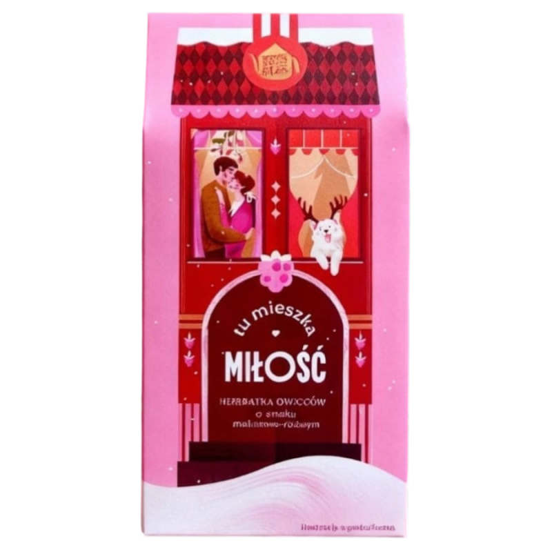 Tu mieszka Miłość to owocowo-kwiatowa herbatka malinowo-różana na bazie hibiskusa i owoców. Bez kofeiny, idealna do picia wieczorem i dla dzieci. Edycja świąteczna pełna ciepła, bliskości i domowych emocji.