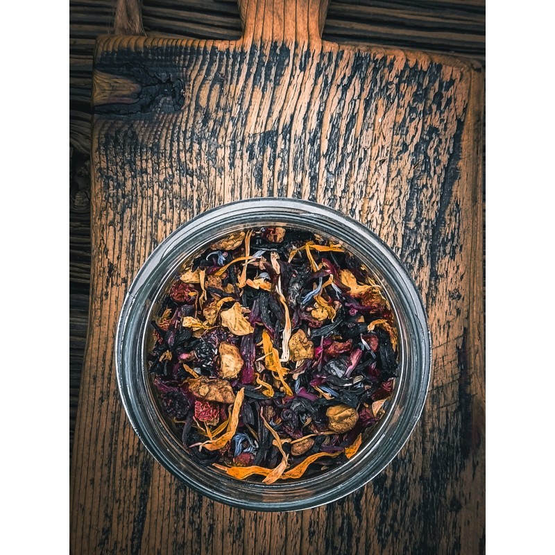 Skład: hibiskus, dzika róża, bławatek, wiśnia, nagietek, jarzębina, jabłko