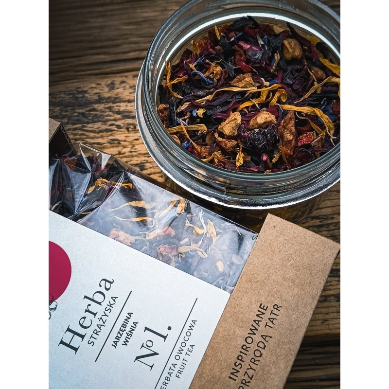 Jarzębina, mimo że często kojarzona z ptasim menu, jest jadalna – zwłaszcza po suszeniu lub gotowaniu. W tradycyjnej medycynie ludowej stosowano ją na „wzmacnianie krwi” i w domowych nalewkach. W herbacie STRĄŻYSKA dodaje górskiego charakteru i lekko cierpkiej nuty, która świetnie równoważy słodycz wiśni.