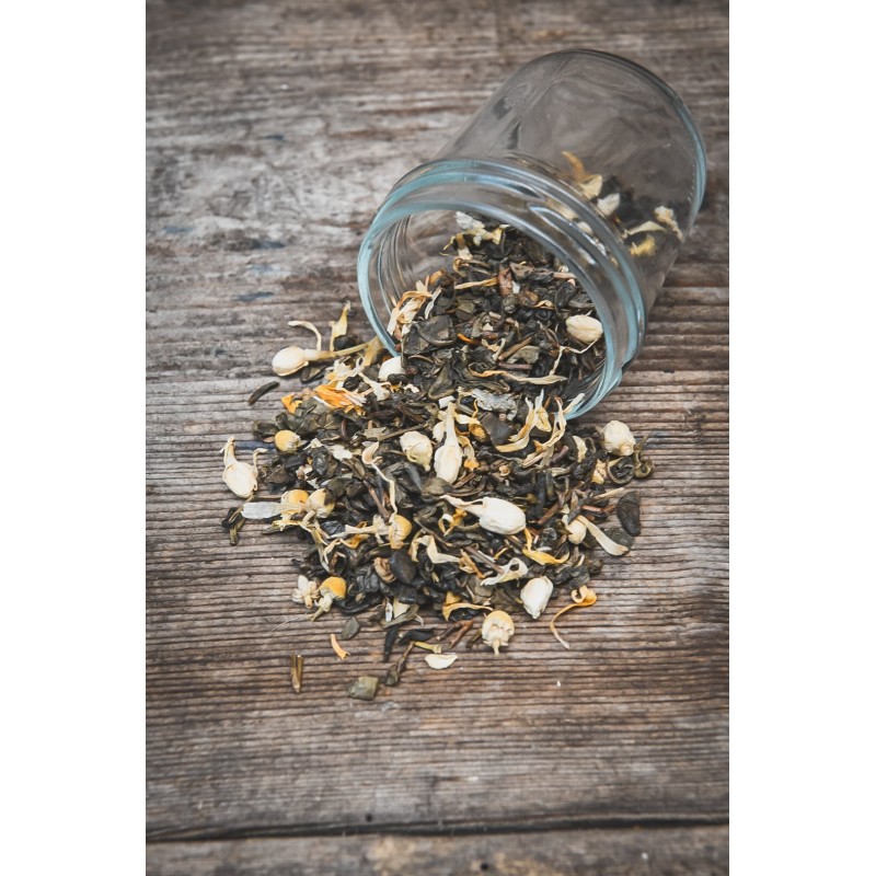 Skład: zielona herbata, jaśmin, nagietek, rumianek