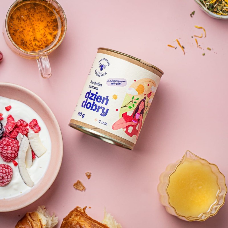 „Dzień dobry” to ziołowa mieszanka z adaptogenami – bez kofeinowego rollercoastera, za to z łagodną, stabilną energią, która stawia na nogi bez szarpania układu nerwowego. Ashwagandha, żeń-szeń i guarana robią swoje, a mięta, cytrusy i nagietek pilnują, żeby smak był przyjemny, świeży i poranny — nie apteczny.