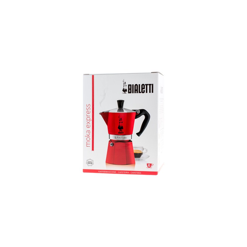 Bialetti Moka Express 6tz w czerwonym kolorze to klasyczna włoska kawiarka o pojemności 300 ml. Parzy 6 espresso jednocześnie, wykonana z aluminium, przeznaczona do kuchenek gazowych, elektrycznych i ceramicznych. Kultowy design od 1933 roku.