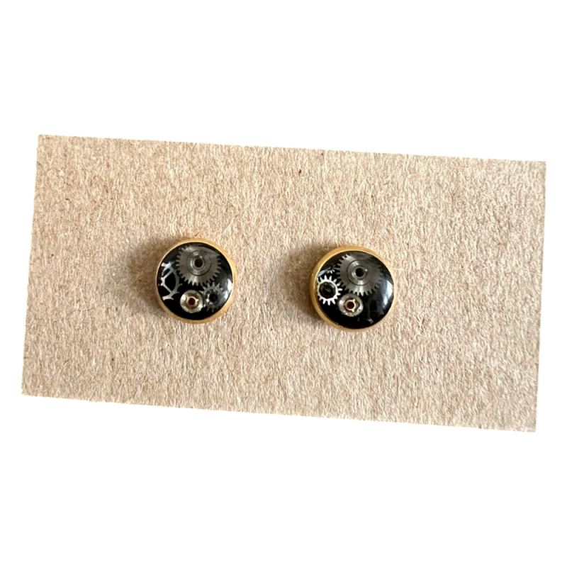 Te ręcznie robione kolczyki to prawdziwa gratka dla miłośników minimalistycznego designu! Miniaturowe elementy mechanizmów zegarka zostały oprawione w stal szlachetną, zapewniającą hipoalergiczność. Zębatki zatopione są w ochronnej powłoce, która wydobywa ich industrialny urok.