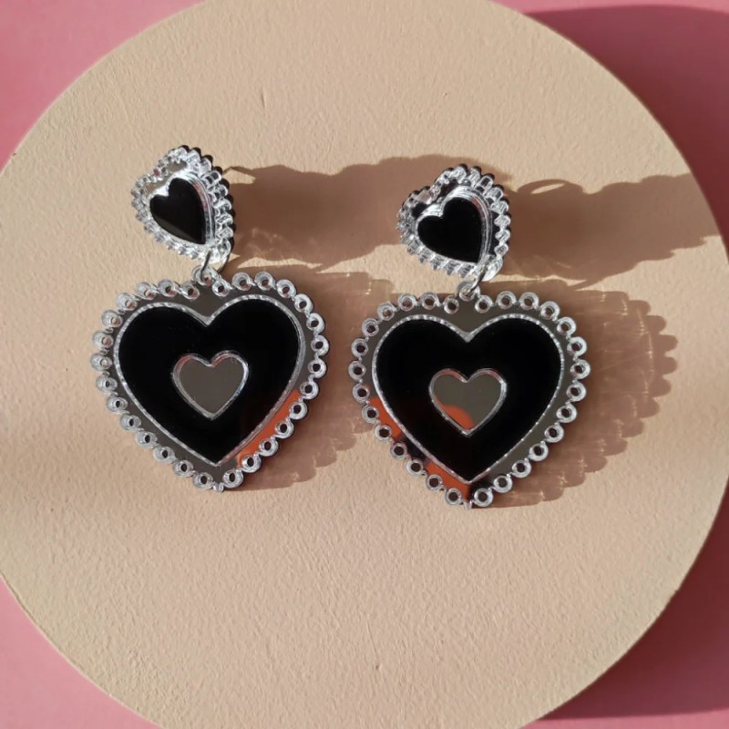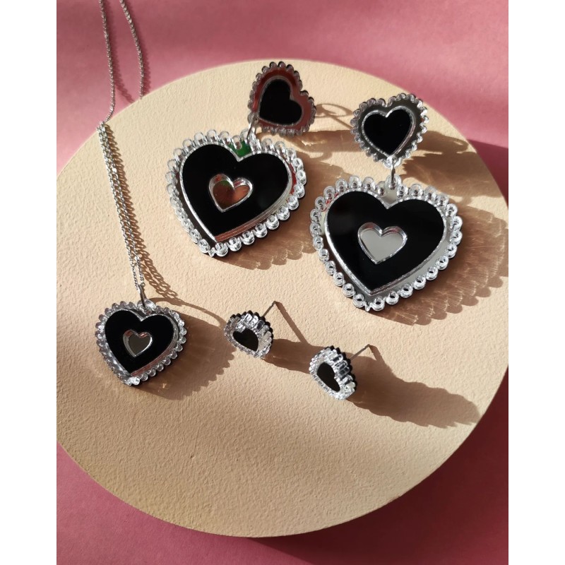 Kolczyki z serii Amour Maxi to wyjątkowe dodatki, które zachwycają swoją unikalną formą i eleganckim połączeniem czerni i srebra. Wykonane z akrylu, są trwałe, lekkie i błyszczące, co sprawia, że doskonale sprawdzą się jako wyrazisty akcent każdej stylizacji.
