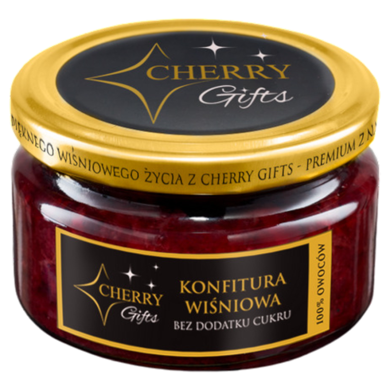 Naturalna konfitura wiśniowa bez cukru Cherry Gifts. 86% polskich wiśni, zagęszczony sok jabłkowy i pektyna. Ręcznie tworzona, gęsta, intensywna, idealna do pieczywa, deserów i serów. Krótki skład, bez konserwantów i GMO.