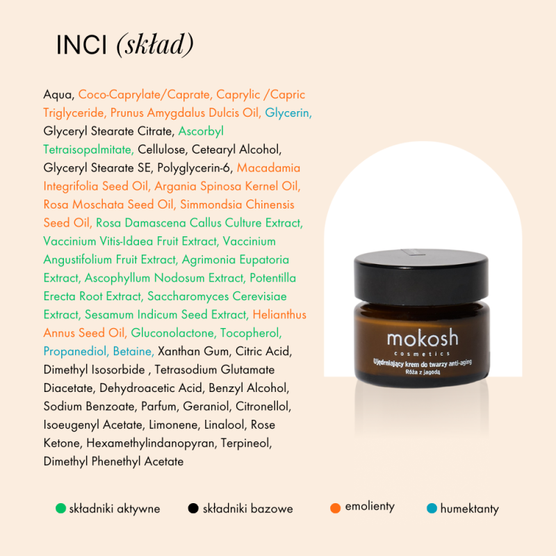 Skład INCI: Aqua, Coco-Caprylate/Caprate, Caprylic/Capric Triglyceride, Prunus Amygdalus Dulcis Oil, Glycerin, Glyceryl Stearate Citrate, Ascorbyl Tetraisopalmitate, Cellulose, Cetearyl Alcohol, Glyceryl Stearate SE, Polyglycerin-6, Macadamia Integrifolia Seed Oil, Argania Spinosa Kernel Oil, Rosa Moschata Seed Oil, Simmondsia Chinensis Seed Oil, Rosa Damascena Callus Culture Extract, Vaccinium Vitis-Idaea Fruit Extract, Vaccinium Angustifolium Fruit Extract, Agrimonia Eupatoria Extract, Ascophyllum Nodosum Extract, Potentilla Erecta Root Extract, Saccharomyces Cerevisiae Extract, Sesamum Indicum Seed Extract, Helianthus Annus Seed Oil, Gluconolactone, Tocopherol, Propanediol, Betaine, Xanthan Gum, Citric Acid, Dimethyl Isosorbide, Tetrasodium Glutamate Diacetate, Dehydroacetic Acid, Benzyl Alcohol, Sodium Benzoate, Parfum, Geraniol, Citronellol, Isoeugenyl Acetate, Limonene, Linalool, Rose Ketone, Hexamethylindanopyran, Terpineol, Dimethyl Phenethyl Acetate.