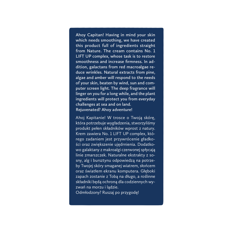 Ahoj Kapitanie! to lekki, naturalny krem przeciwzmarszczkowy stworzony z myślą o męskiej skórze, która chce wyglądać lepiej, ale nie znosi kombinowania. Działa szybko, konkretnie i bez zbędnych ceregieli – nawilża, wygładza, odżywia i przy okazji pachnie jak facet z charakterem.