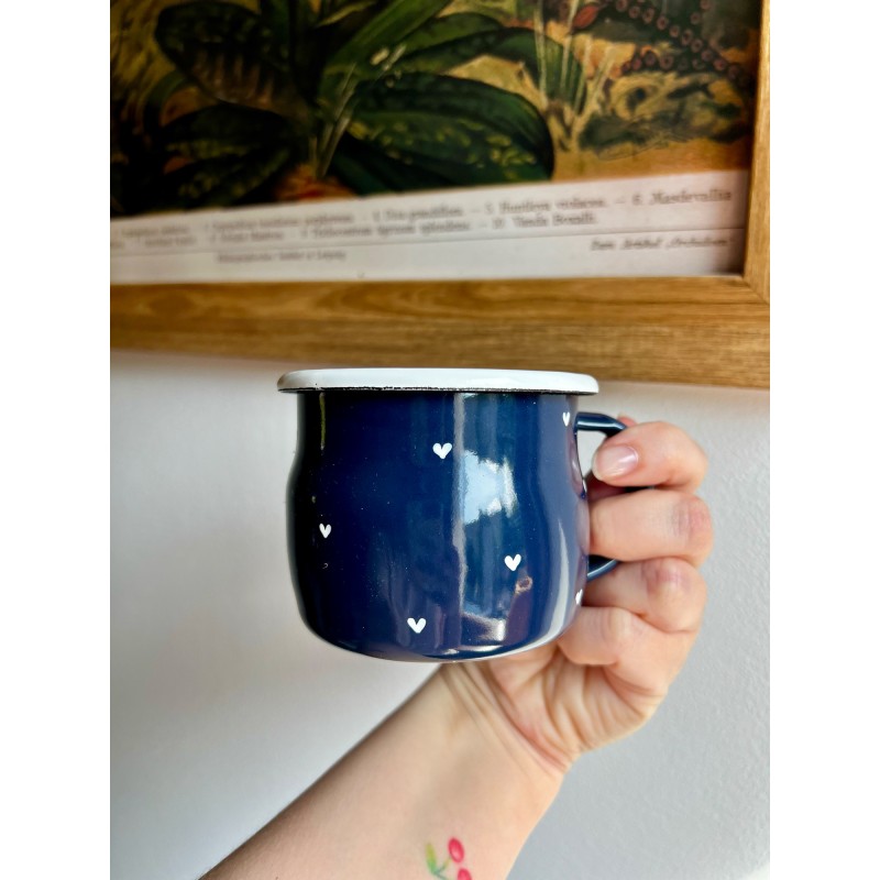 Granatowy kubek emaliowany 330 ml, ręcznie malowany w białe serca. Lekki, trwały i nostalgiczny. Idealny na prezent, do herbaty, kakao i kawy. Emalia odporna na uszkodzenia. Styl retro, do domu i pleneru.