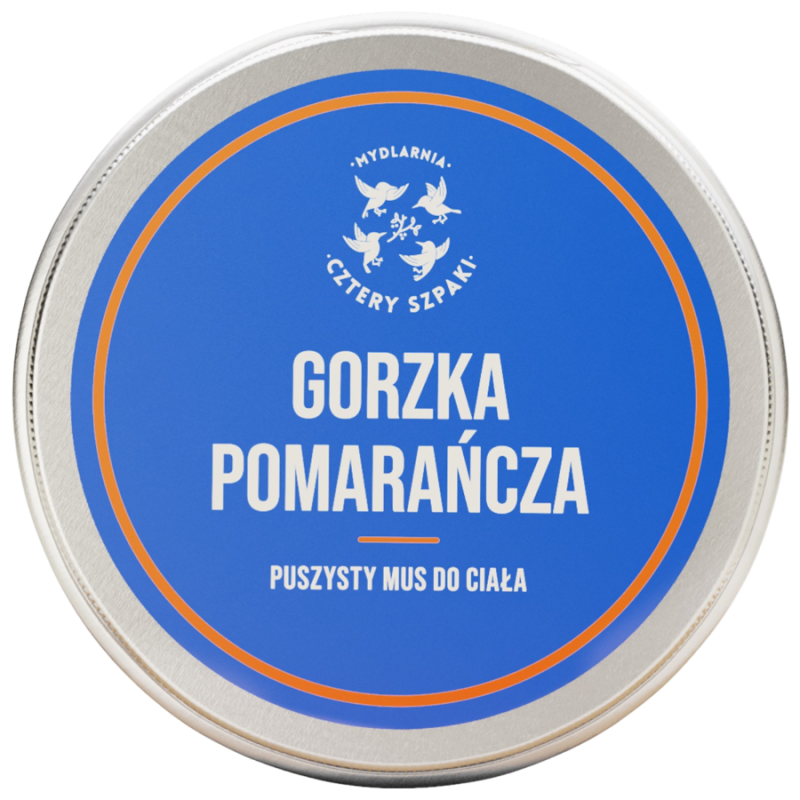 Naturalny puszysty mus do ciała Gorzka Pomarańcza od 4 Szpaków to lekki, odżywczy krem o cytrusowym zapachu pomarańczy, mandarynki i petitgrain. Nawilża, regeneruje i poprawia nastrój. Idealny dla skóry suchej, normalnej i zmęczonej. 100% natury, wegański skład, polska marka.