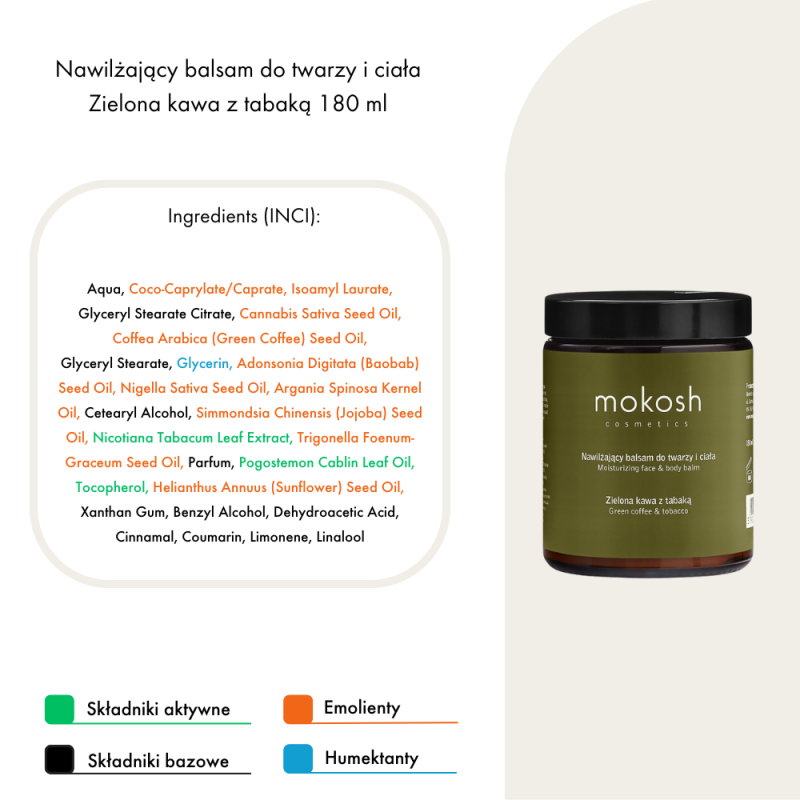 Nawilżający balsam do twarzy i ciała Zielona kawa z tabaką Mokosh to lekka, roślinna pielęgnacja o ziołowo-balsamicznym zapachu. Szybko się wchłania, nawilża, regeneruje i chroni skórę przed czynnikami zewnętrznymi. Jeden kosmetyk, wiele zastosowań.