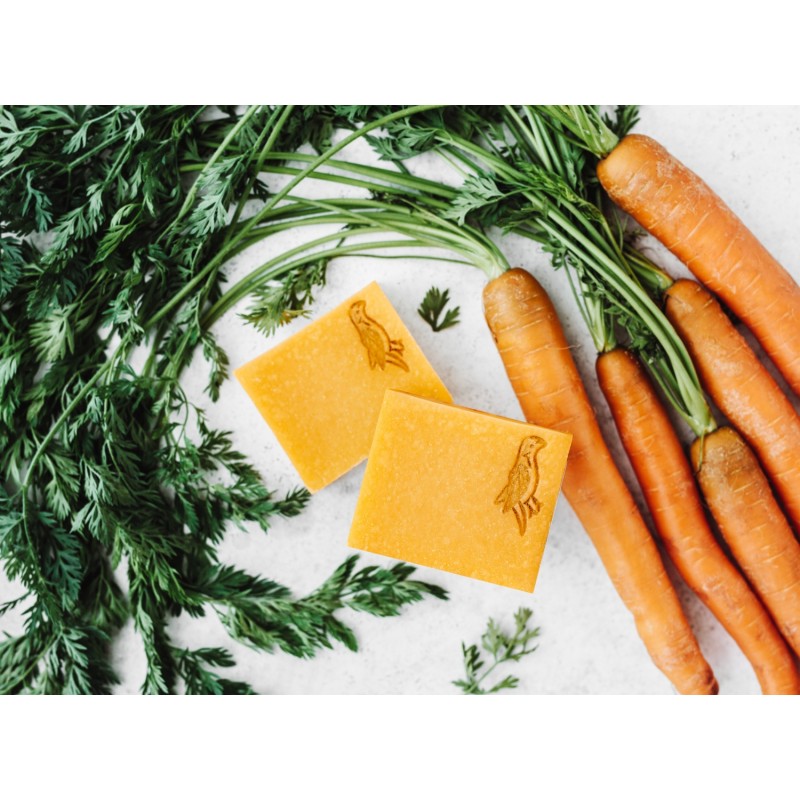 Karoten z pulpy marchwiowej nadaje mu nie tylko bajeczny kolor, ale też właściwości pielęgnujące. Olejki eteryczne z bergamotki i słodkiej pomarańczy sprawiają, że kąpiel staje się energetycznym rytuałem. Z kolei sympatyczna papużka odciśnięta w kostce – rozbraja każdego marudę.