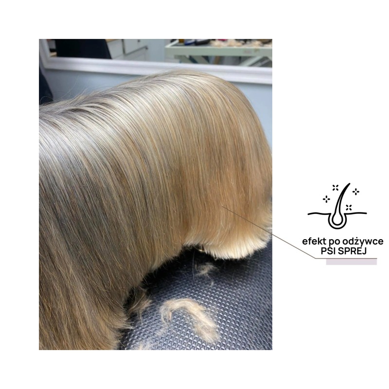 Spryskaj sierść, rozczesz. Gotowe. Działa zarówno na sucho, jak i zaraz po kąpieli. Omijaj oczy i uszy – bo to nie tonik, tylko spa dla futra.