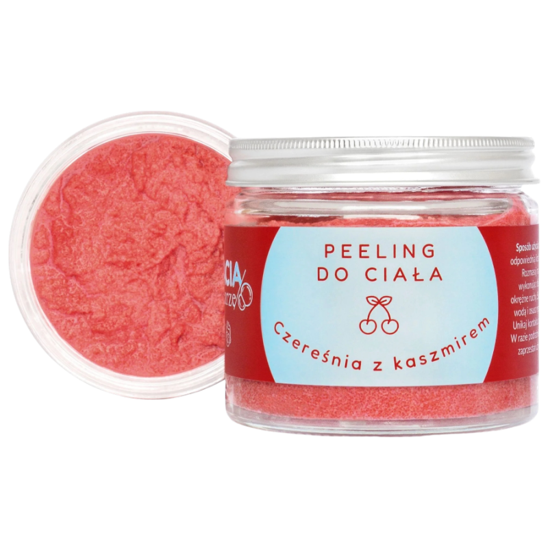 Peeling cukrowy Czereśnia z Kaszmirem 250 g to skuteczne złuszczanie i odżywienie w jednym. Zawiera olej z pestek wiśni, masło shea i witaminę E. Wygładza skórę, ogranicza TEWL i pozostawia zmysłowy zapach czereśni, bursztynu i bergamoty.