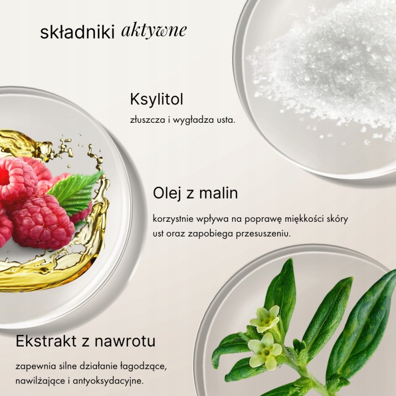 Kiedy usta domagają się ratunku, a wiatr i suche powietrze nie mają litości – ta malinowa bohaterka wkracza do akcji. Łączy działanie peelingu z kojącą mocą maski. Złuszcza, regeneruje, nawilża i zostawia na ustach satynową miękkość oraz subtelną ochronną warstewkę. Tak, to kosmetyczny multitasking w malinowym wydaniu. ????