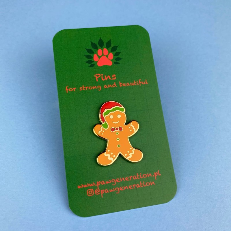 Pin "Piernik" to urocza przypinka przedstawiająca klasyczną świąteczną postać piernikowego ludzika. Jego uśmiechnięta twarz oraz detale takie jak czerwona czapka i świąteczne ozdoby sprawiają, że jest idealnym dodatkiem na zimowy sezon.