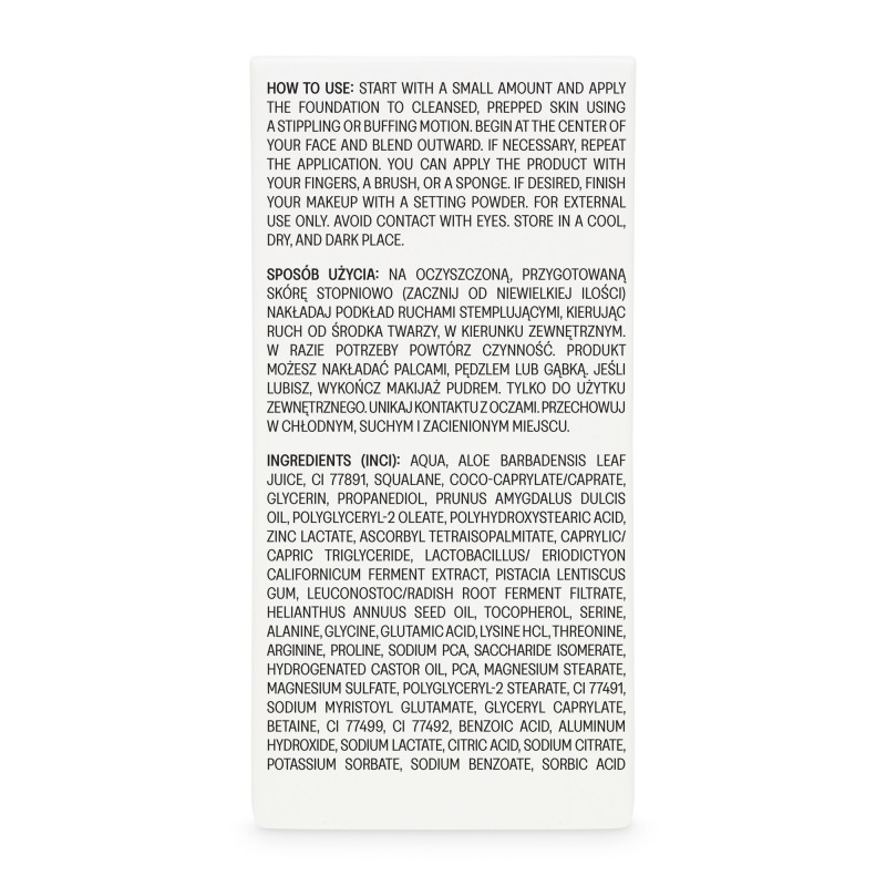 Aqua, Aloe Barbadensis Leaf Juice, CI 77891, Squalane, Coco-Caprylate/Caprate, Glycerin, Propanediol, Prunus Amygdalus Dulcis Oil, Polyglyceryl-2 Oleate, Polyhydroxystearic Acid, Zinc Lactate, Ascorbyl Tetraisopalmitate, Caprylic/Capric Triglyceride, Lactobacillus/Eriodictyon Californicum Ferment Extract, Pistacia Lentiscus Gum, Leuconostoc/Radish Root Ferment Filtrate, Helianthus Annuus Seed Oil, Tocopherol, Serine, Alanine, Glycine, Glutamic Acid, Lysine Hcl, Threonine, Arginine, Proline, Sodium PCA, Saccharide Isomerate, Hydrogenated Castor Oil, PCA, Magnesium Stearate, Magnesium Sulfate, Polyglyceryl-2 Stearate, CI 77491, Sodium Myristoyl Glutamate, Glyceryl Caprylate, Betaine, CI 77499, CI 77492, Benzoic Acid, Aluminum Hydroxide, Sodium Lactate, Citric Acid, Sodium Citrate, Potassium Sorbate, Sodium Benzoate, Sorbic Acid