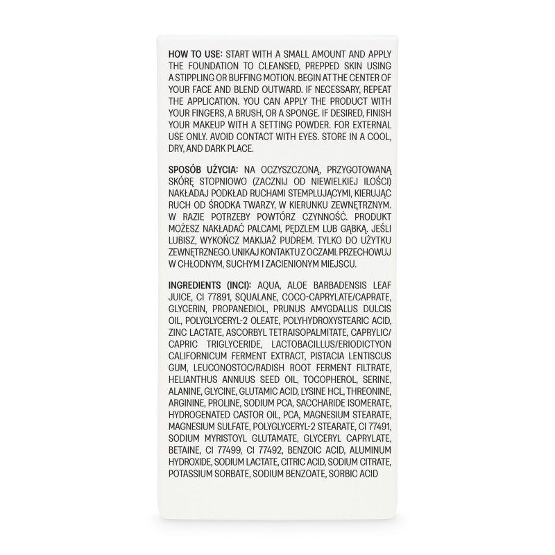 Na oczyszczoną skórę nałóż ulubiony krem lub serum. Nakładaj podkład stemplując – palcami, pędzlem lub gąbką. Rozprowadzaj od środka twarzy ku zewnętrznym partiom. Krycie za lekkie? Dodaj drugą warstwę. Pudru nie trzeba – ale jeśli chcesz, możesz. Wolność wyboru.