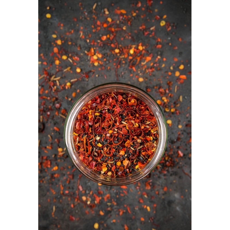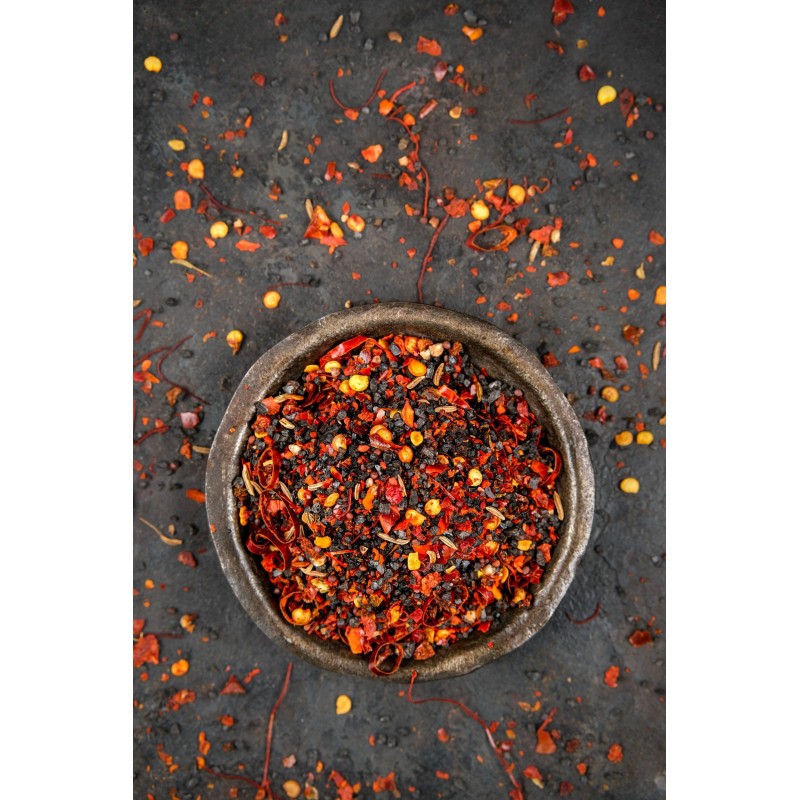 Sypać śmiało tam, gdzie potrzeba ognia i głębi. Jako wykończenie dania lub baza do przyprawiania. Świetnie łączy się z mięsem, rybami, warzywami i kuchnią fusion. W niewielkiej ilości wystarczy, by dodać potrawom wyjątkowej ostrości i aromatu.