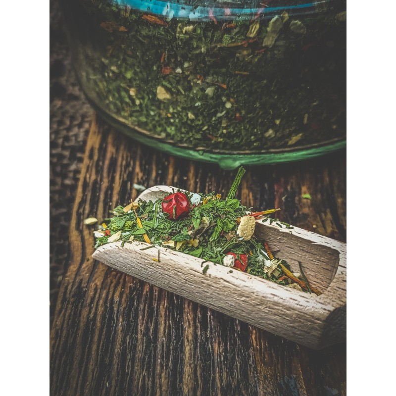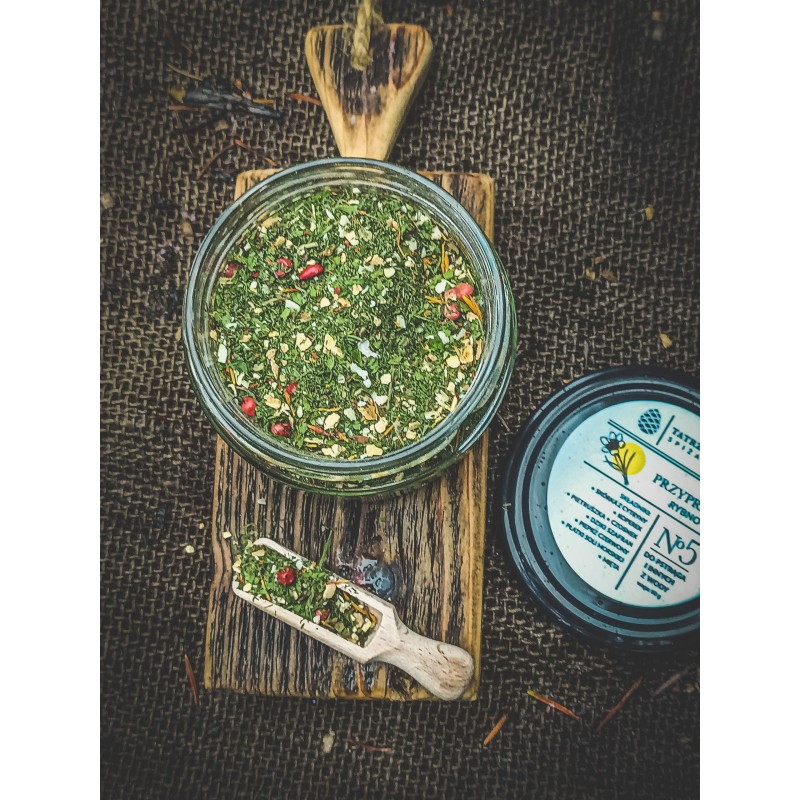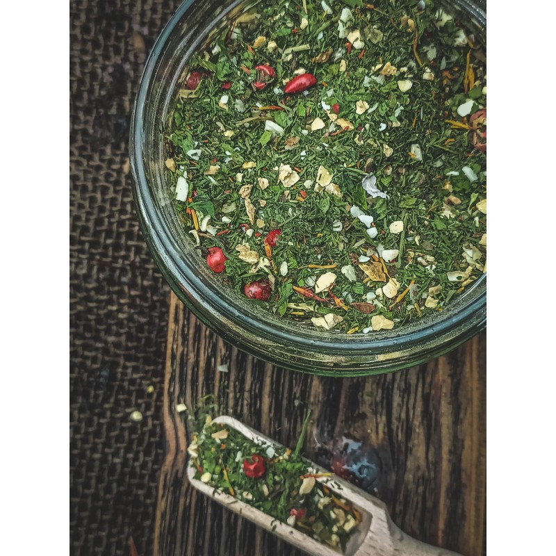 Składniki: skórka z cytryny, koperek, pietruszka, czosnek, dziki szafran, pieprz czerwony, płatki soli himalajskiej, mięta.