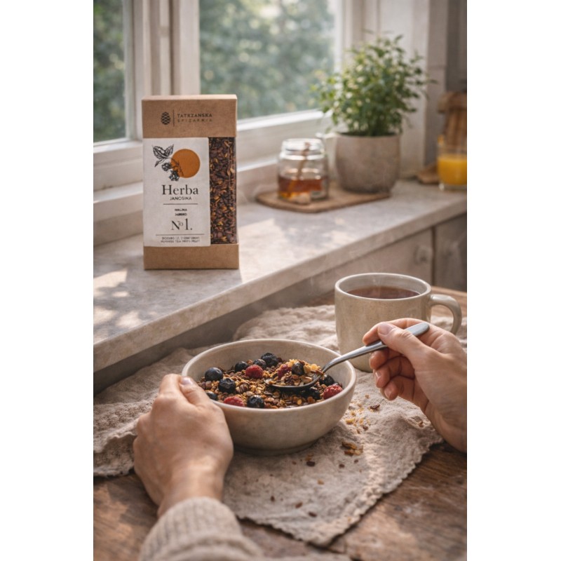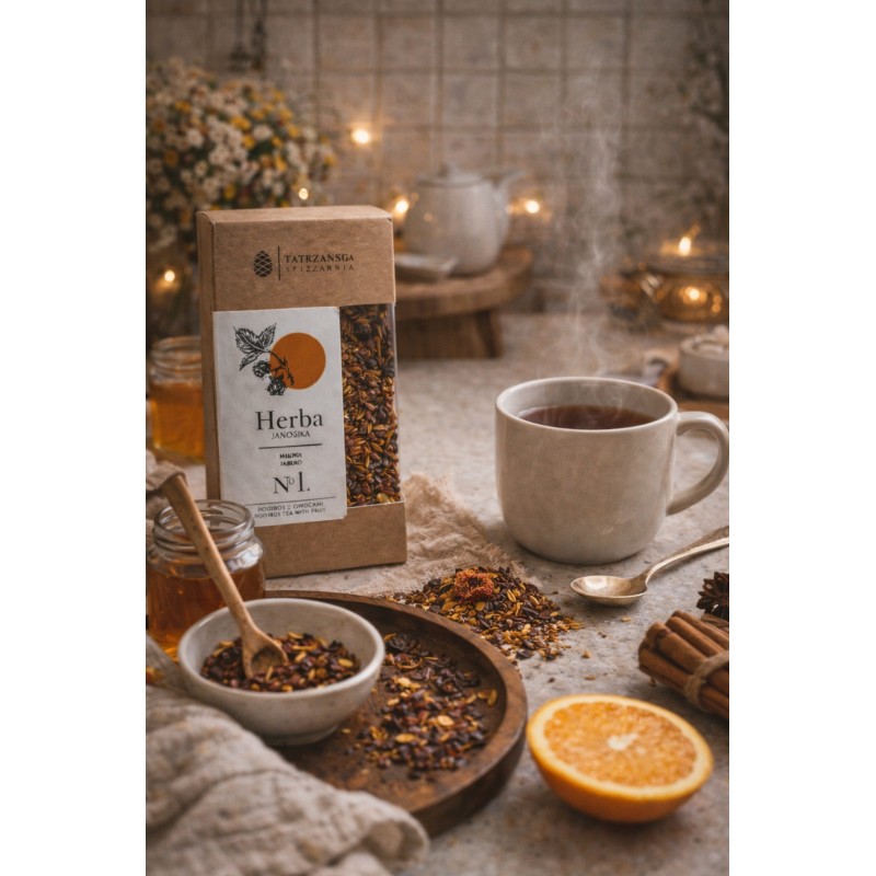Herba Janosika od Tatrzańskiej Spiżarni to łagodny, bezkofeinowy napar z rooibosa, hibiskusa, dzikiej róży, jabłka, maliny i nagietka. Rubinowa barwa, delikatny owocowo-kwiatowy smak i rozgrzewający charakter sprawiają, że idealnie sprawdza się na spokojne wieczory.