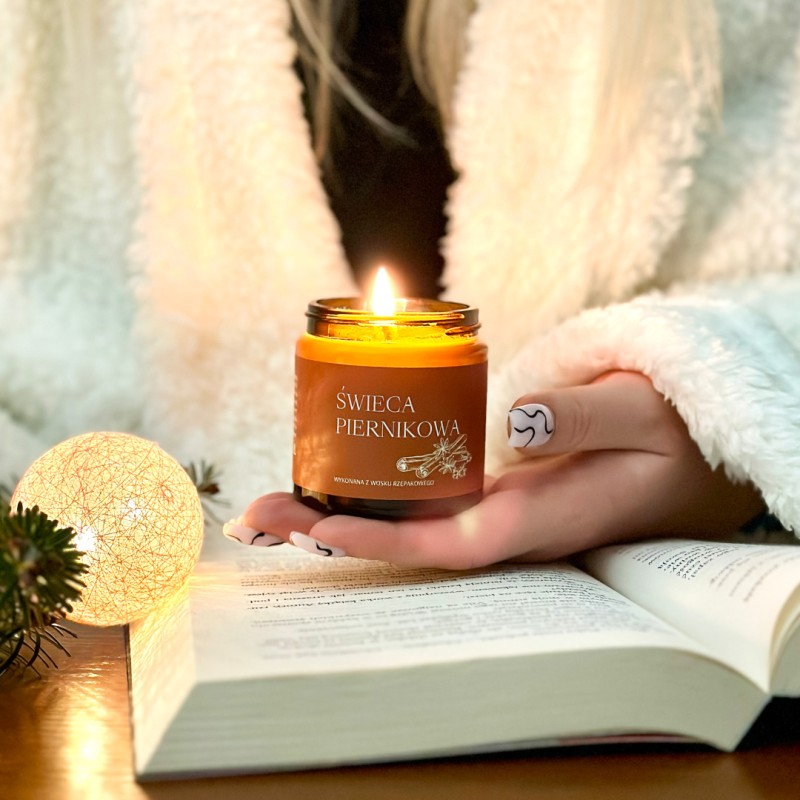 ✩ Zapach: "Świeca Piernikowa" uwalnia ciepłe nuty korzennych przypraw, miodu, i karmelizowanego cukru, które przypominają o domowych wypiekach i świątecznym nastroju. Olejki eteryczne użyte w kompozycjach zapachowych nie tylko pięknie pachną, ale także działają terapeutycznie – pomagają wyciszyć się, odnaleźć wewnętrzną równowagę i głęboko się zrelaksować.