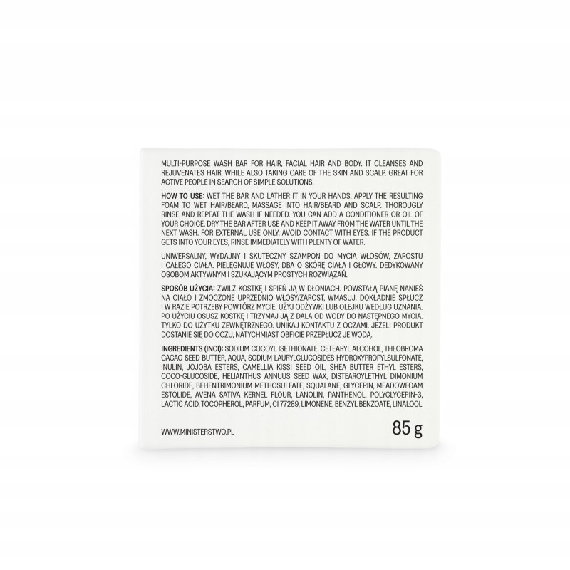 Szampon w kostce do włosów, ciała i zarostu. Oczyszcza, odświeża, dodaje objętości. Kompaktowy, skuteczny i lekki – idealny w podróży i na co dzień.