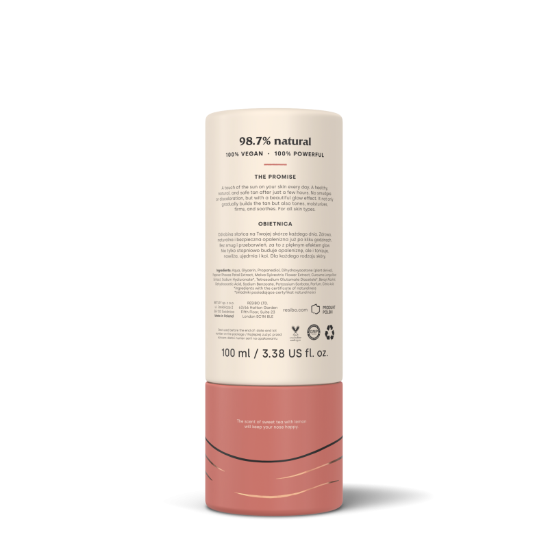 Skład (INCI): Aqua, Glycerin, Propanediol, Dihydroxyacetone* (plant derived), Papaver Rhoeas Petal Extract, Malva Sylvestris Flower Extract, Curcuma Longa Root Extract, Sodium Hyaluronate*, Tetrasodium Glutamate Diacetate*, Benzyl Alcohol, Dehydroacetic Acid, Sodium Benzoate, Potassium Sorbate, Sulfuric Acid, Parfum, Citric Acid