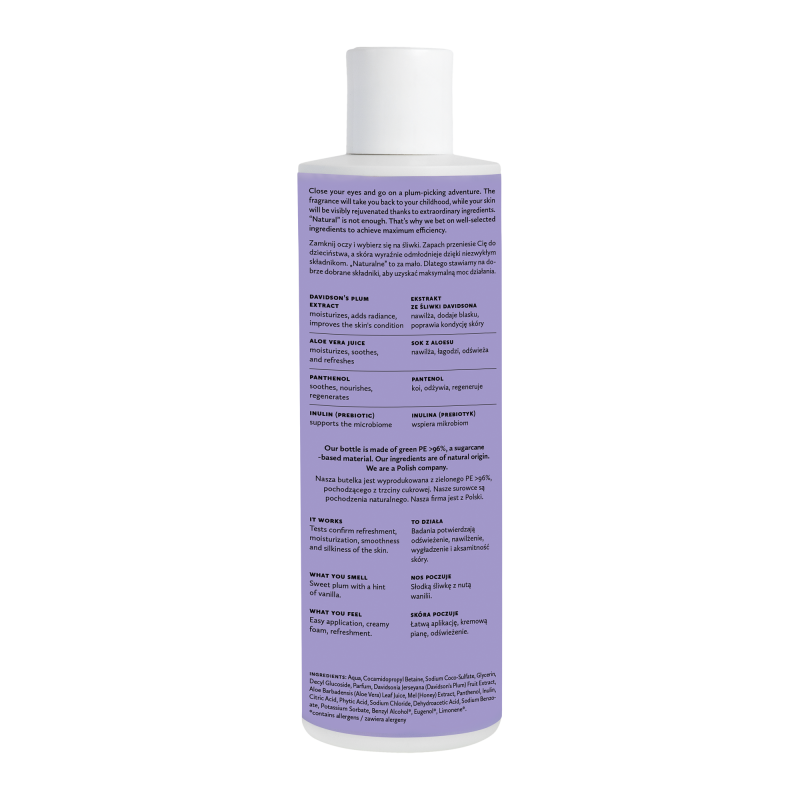 Nanieś na dłoń lub gąbkę, spień i umyj ciało – albo dodaj do kąpieli i zanurz się w słodkiej śliwkowej pianie. Zamknij oczy i pozwól, żeby zapach zrobił resztę.