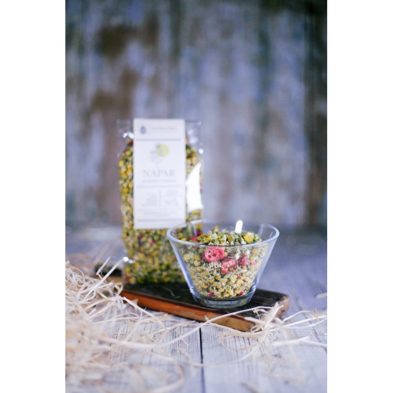 Napar Rumianek & Żurawina to dwuskładnikowa mieszanka z kwiatów rumianku i liofilizowanej żurawiny. Delikatny, bez kofeiny, o miodowo-ziołowym aromacie z lekką owocową nutą. Idealny na wieczór, dla układu trawiennego i codziennego wyciszenia.