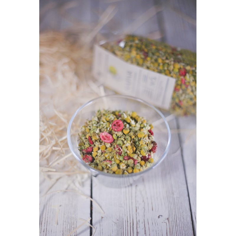 Składniki: kwiat rumianku 85%, żurawina liofilizowana 15%